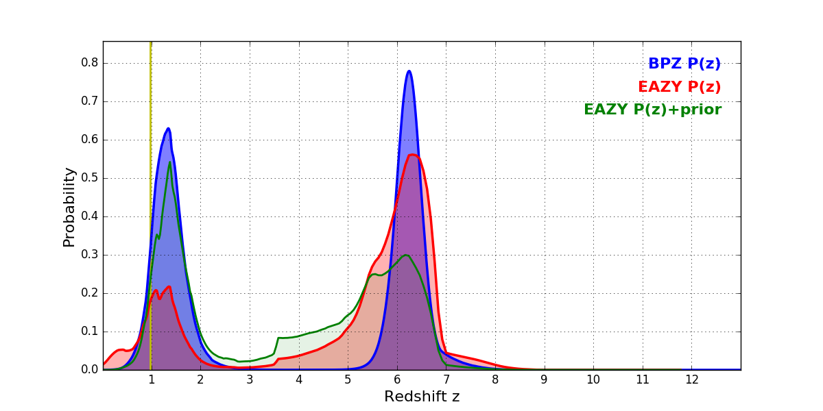 In P(z) plots: Yellow lines mark the cluster redshift z = 0.972,