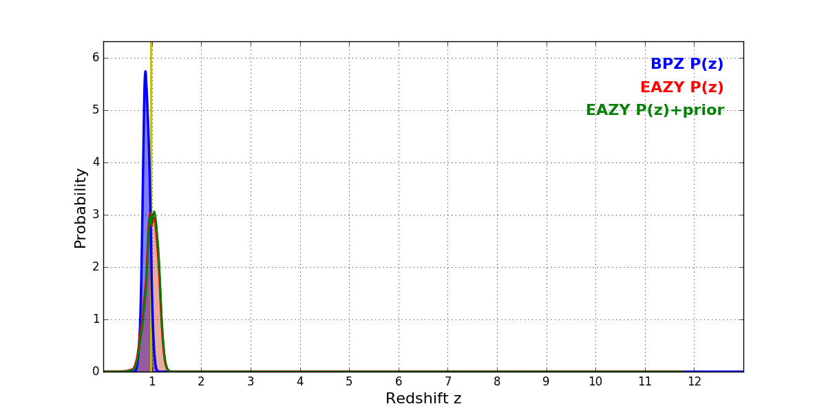 In P(z) plots: Yellow lines mark the cluster redshift z = 0.972,