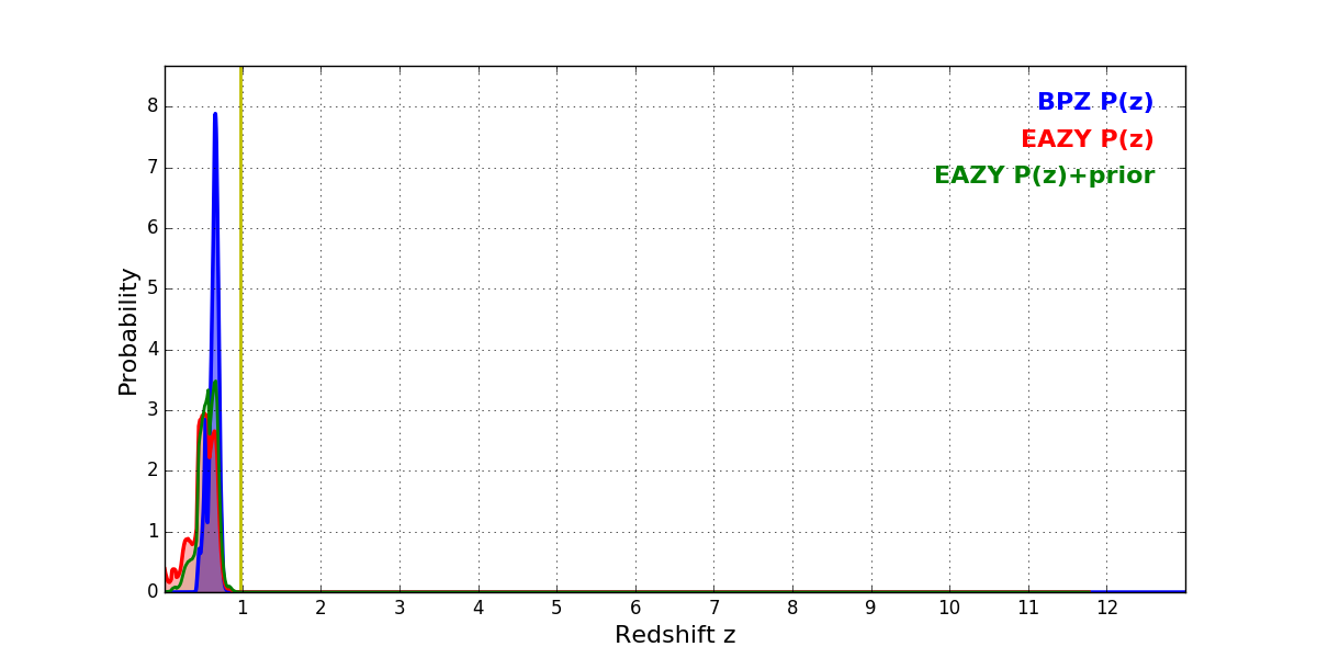 In P(z) plots: Yellow lines mark the cluster redshift z = 0.972,