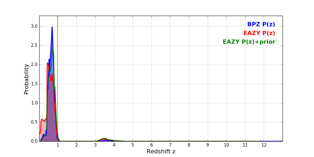 In P(z) plots: Yellow lines mark the cluster redshift z = 0.972,