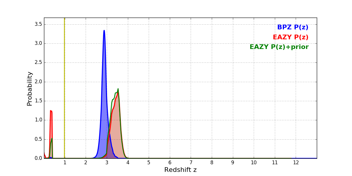 In P(z) plots: Yellow lines mark the cluster redshift z = 0.972,