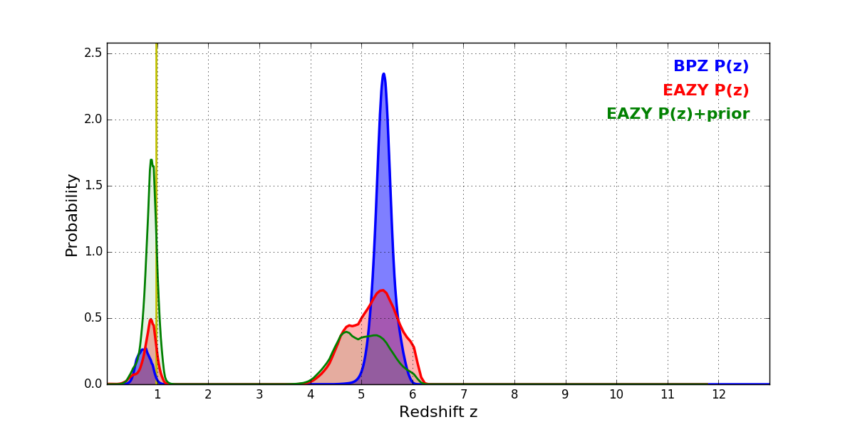 In P(z) plots: Yellow lines mark the cluster redshift z = 0.972,
