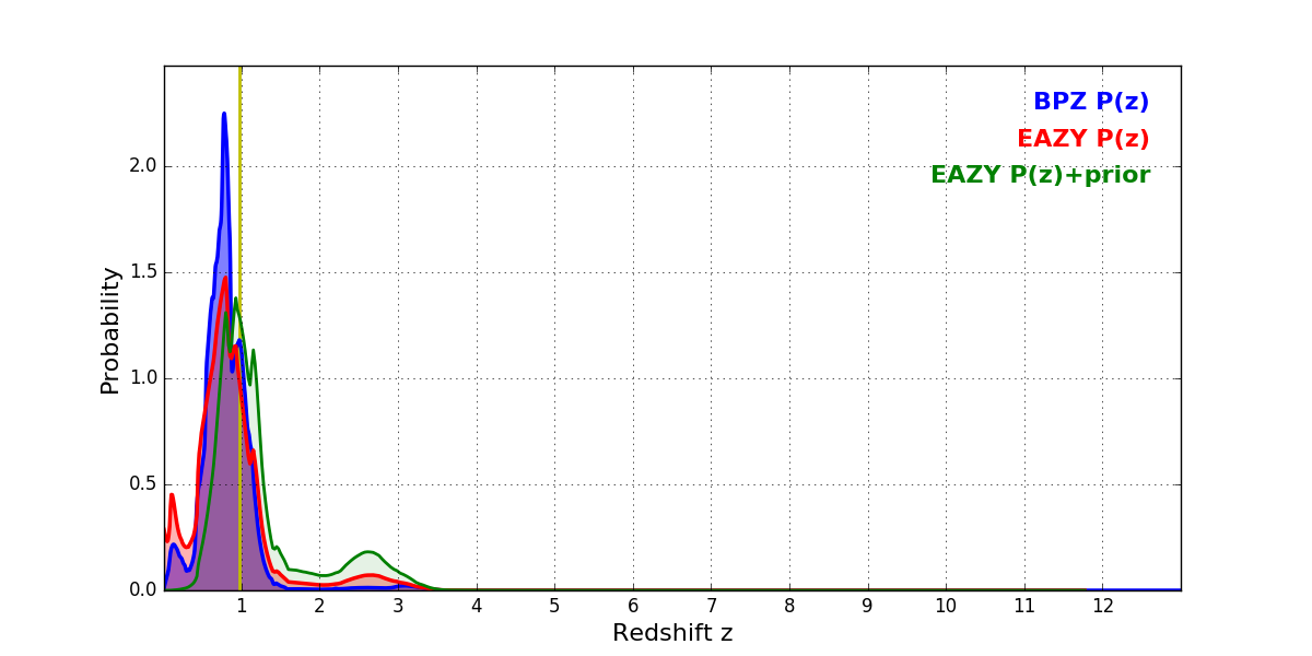 In P(z) plots: Yellow lines mark the cluster redshift z = 0.972,