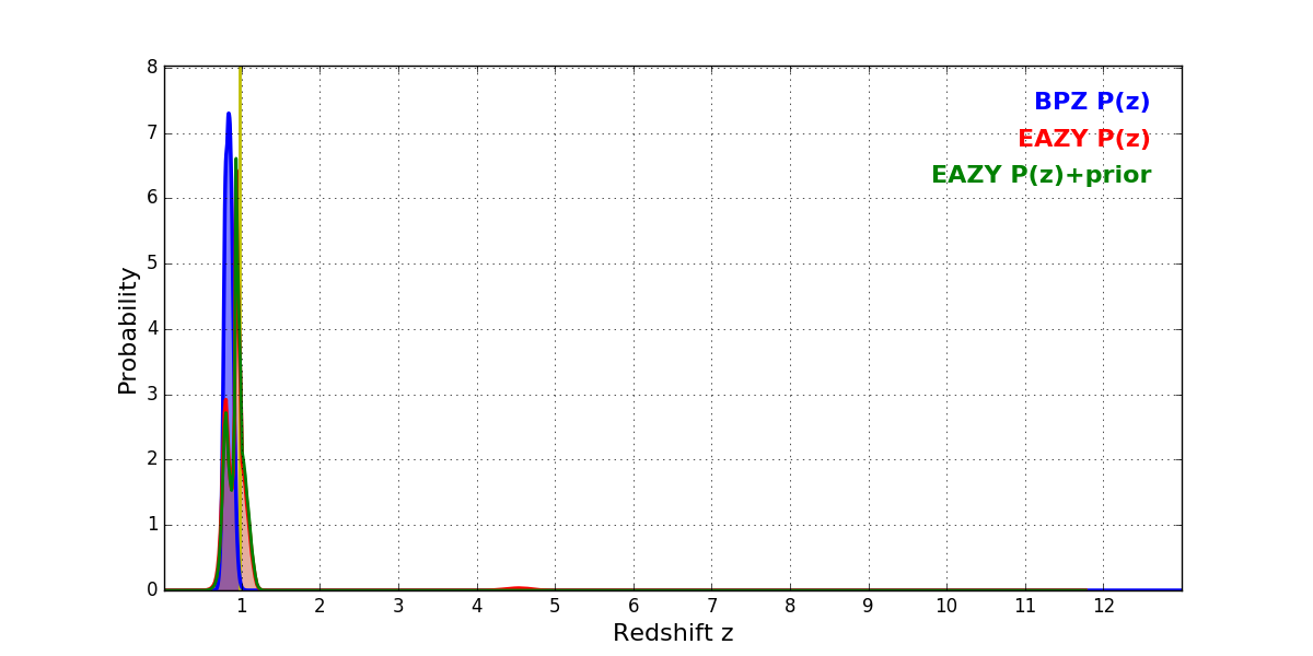 In P(z) plots: Yellow lines mark the cluster redshift z = 0.972,
