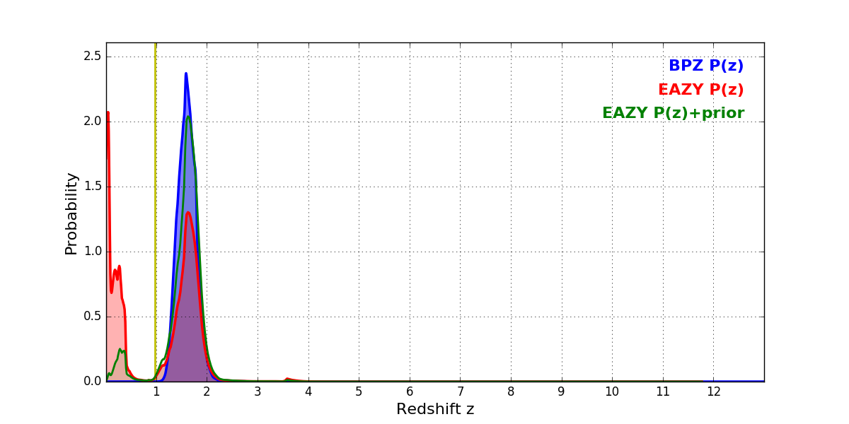 In P(z) plots: Yellow lines mark the cluster redshift z = 0.972,