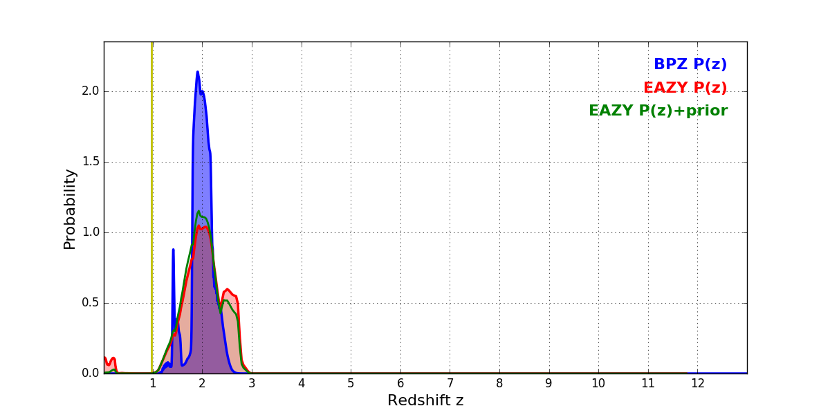 In P(z) plots: Yellow lines mark the cluster redshift z = 0.972,