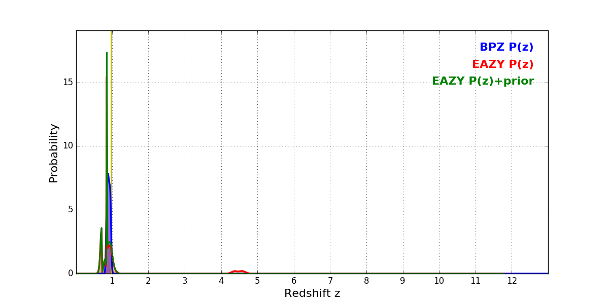 In P(z) plots: Yellow lines mark the cluster redshift z = 0.972,