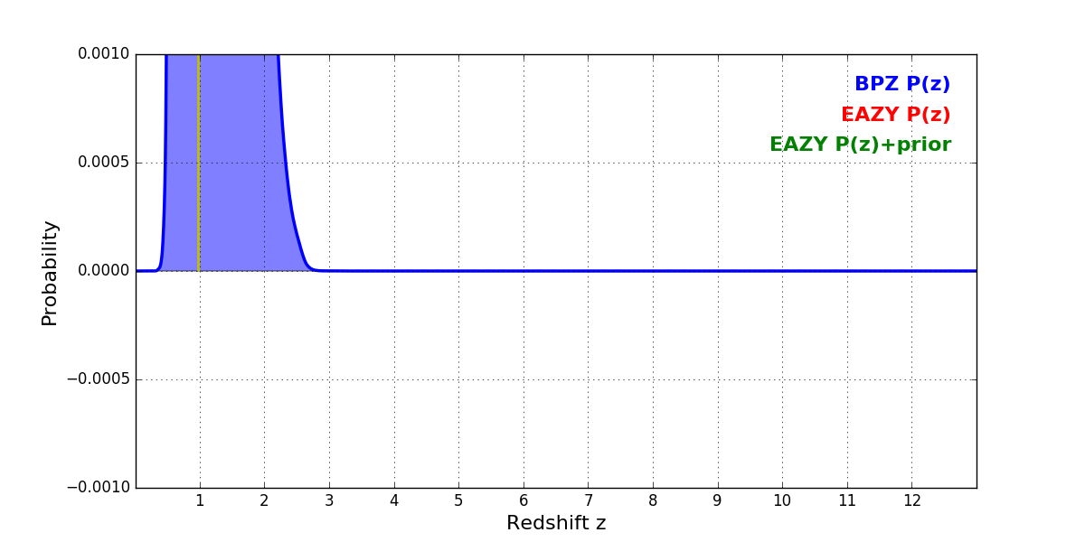 In P(z) plots: Yellow lines mark the cluster redshift z = 0.972,