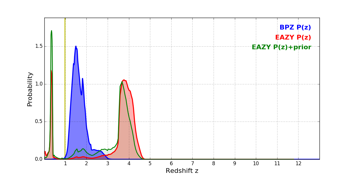 In P(z) plots: Yellow lines mark the cluster redshift z = 0.972,