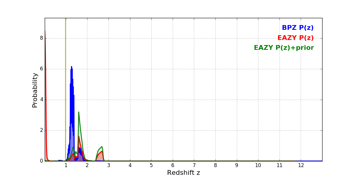In P(z) plots: Yellow lines mark the cluster redshift z = 0.972,