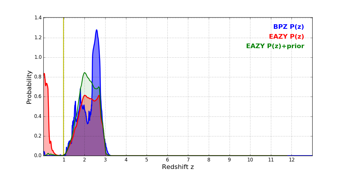 In P(z) plots: Yellow lines mark the cluster redshift z = 0.972,
