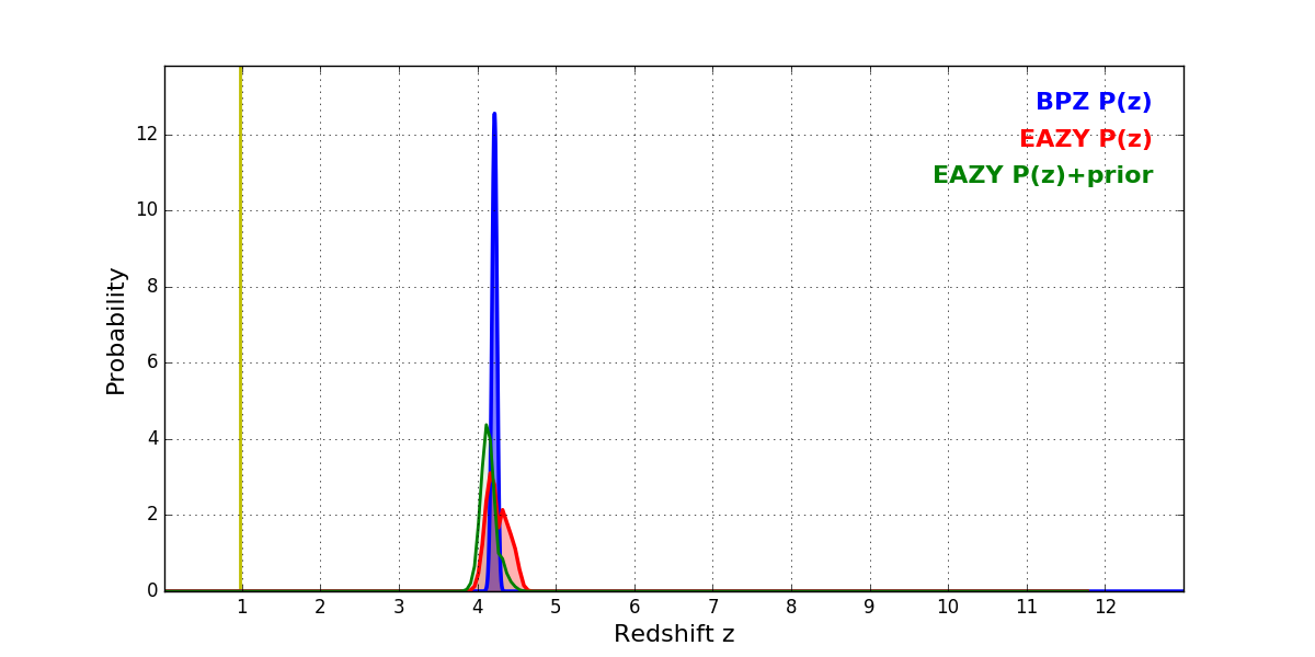 In P(z) plots: Yellow lines mark the cluster redshift z = 0.972,