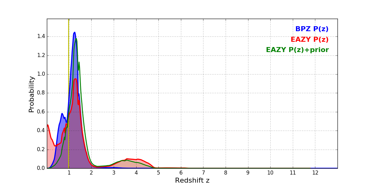 In P(z) plots: Yellow lines mark the cluster redshift z = 0.972,