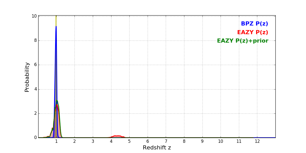 In P(z) plots: Yellow lines mark the cluster redshift z = 0.972,