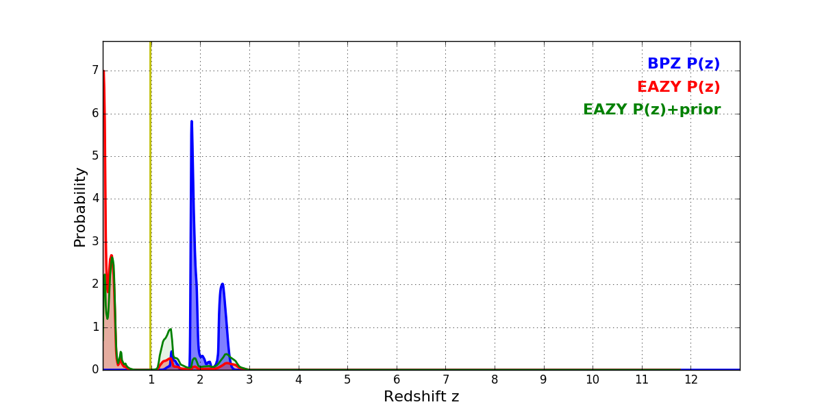 In P(z) plots: Yellow lines mark the cluster redshift z = 0.972,