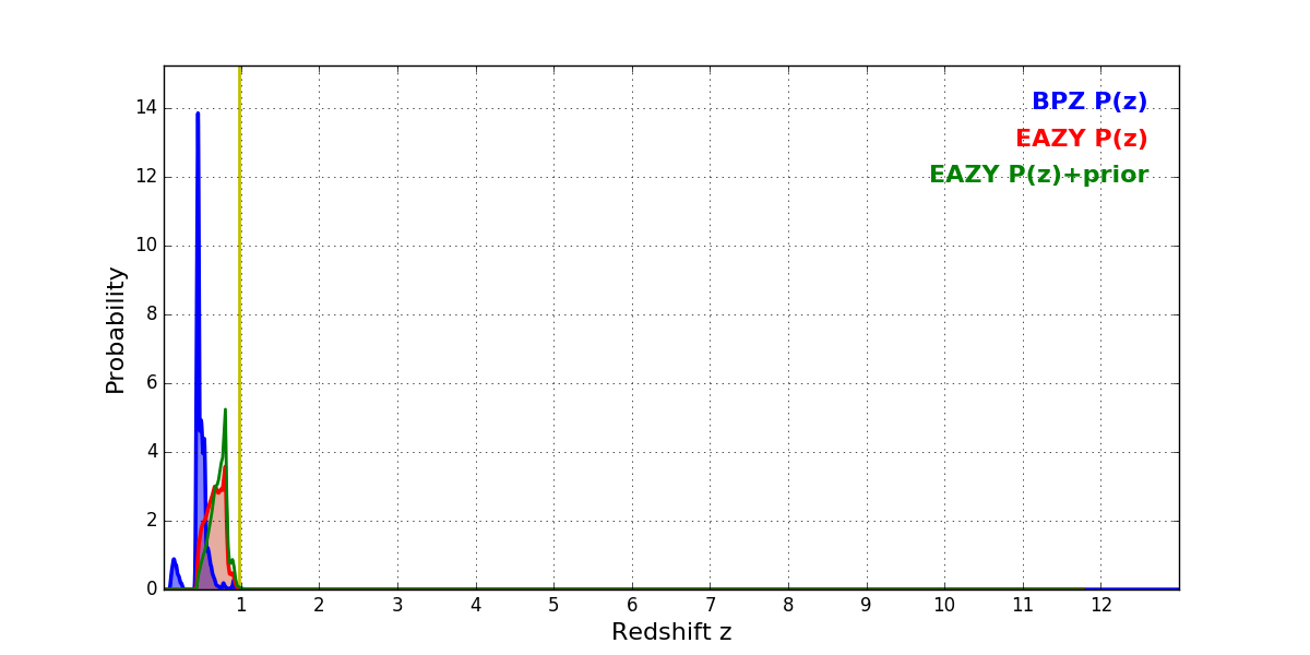 In P(z) plots: Yellow lines mark the cluster redshift z = 0.972,