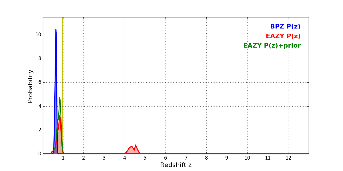 In P(z) plots: Yellow lines mark the cluster redshift z = 0.972,