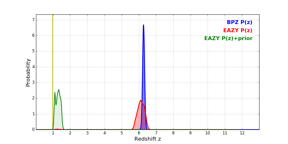 In P(z) plots: Yellow lines mark the cluster redshift z = 0.972,