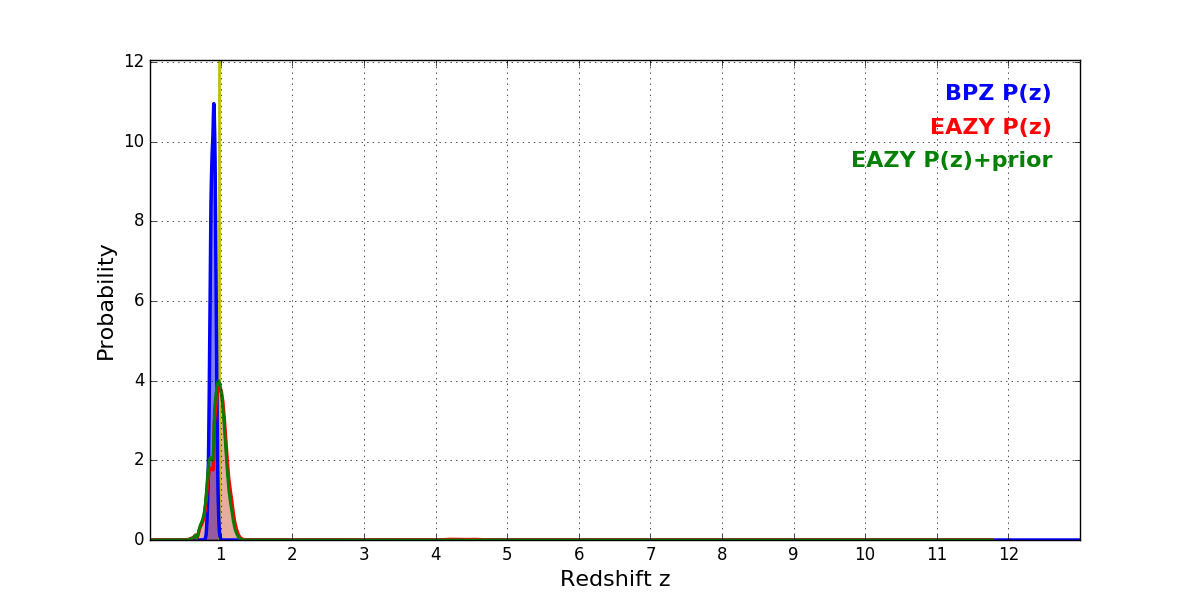 In P(z) plots: Yellow lines mark the cluster redshift z = 0.972,