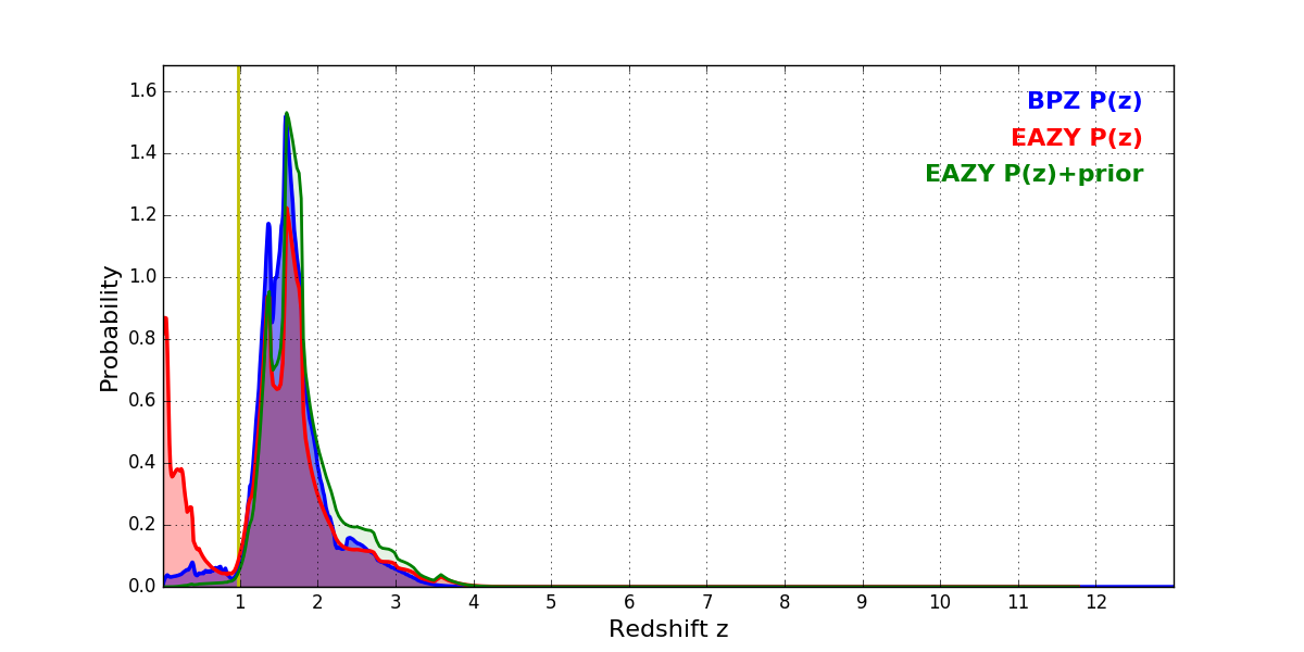 In P(z) plots: Yellow lines mark the cluster redshift z = 0.972,