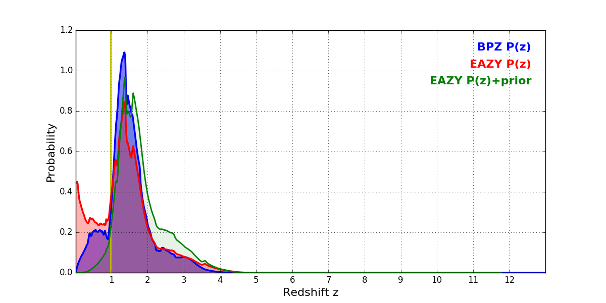 In P(z) plots: Yellow lines mark the cluster redshift z = 0.972,