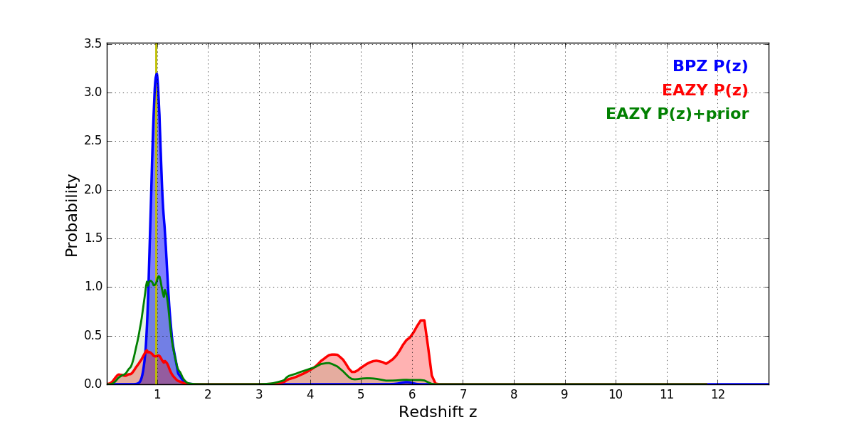 In P(z) plots: Yellow lines mark the cluster redshift z = 0.972,
