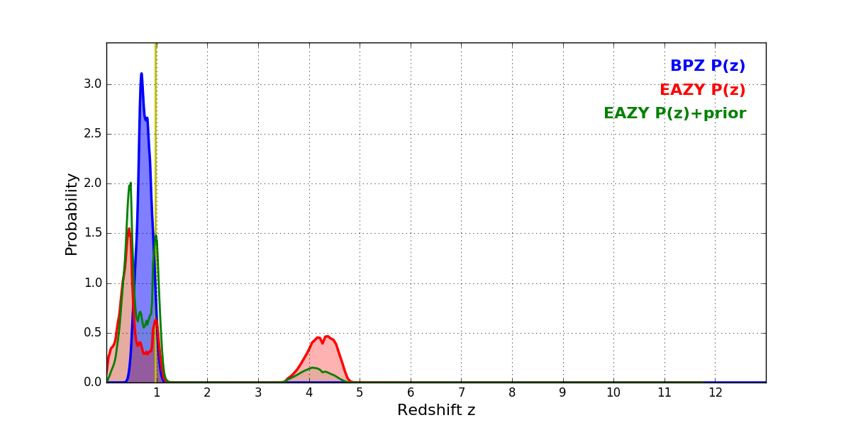 In P(z) plots: Yellow lines mark the cluster redshift z = 0.972,