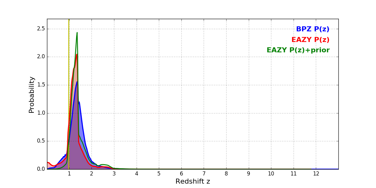 In P(z) plots: Yellow lines mark the cluster redshift z = 0.972,