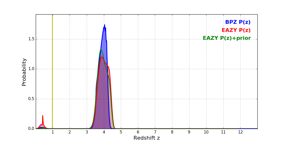 In P(z) plots: Yellow lines mark the cluster redshift z = 0.972,