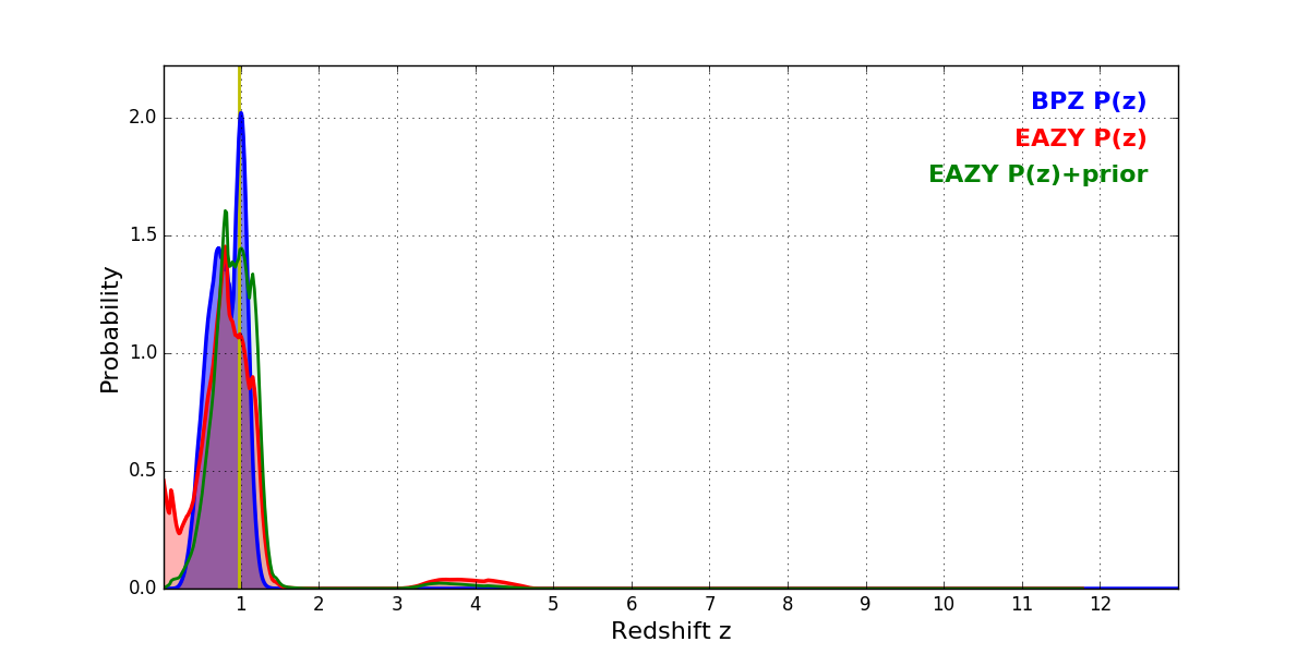 In P(z) plots: Yellow lines mark the cluster redshift z = 0.972,