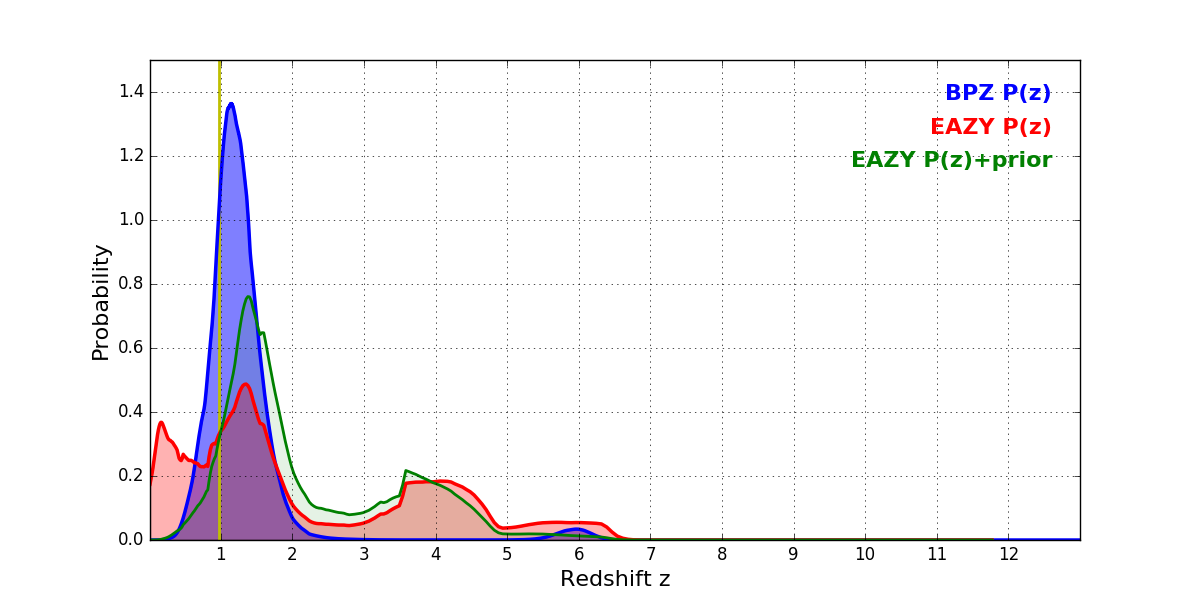 In P(z) plots: Yellow lines mark the cluster redshift z = 0.972,