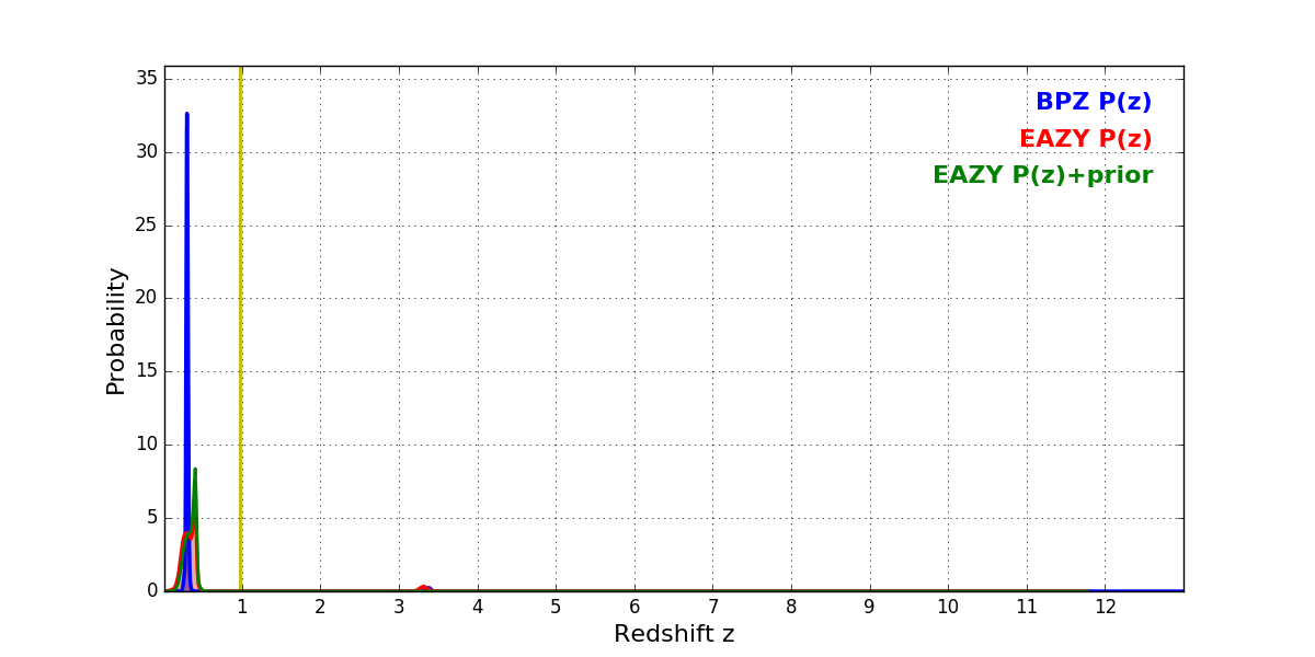 In P(z) plots: Yellow lines mark the cluster redshift z = 0.972,
