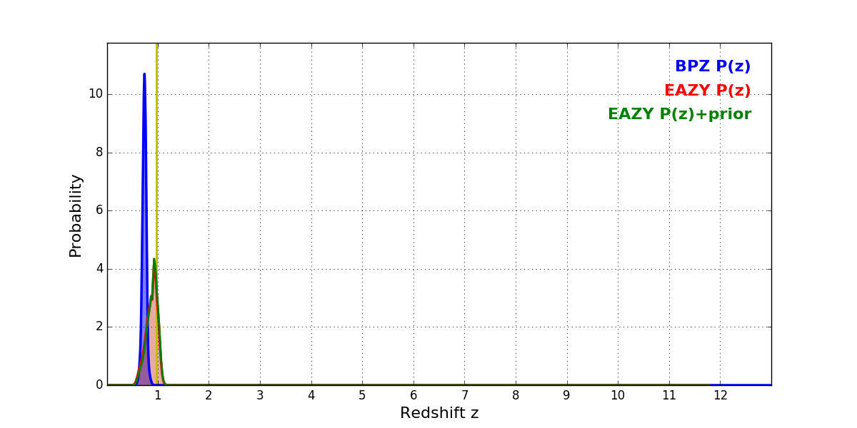 In P(z) plots: Yellow lines mark the cluster redshift z = 0.972,