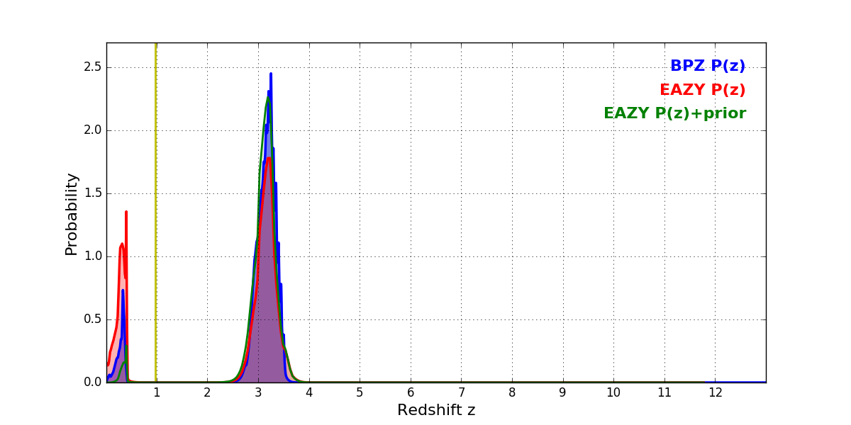 In P(z) plots: Yellow lines mark the cluster redshift z = 0.972,