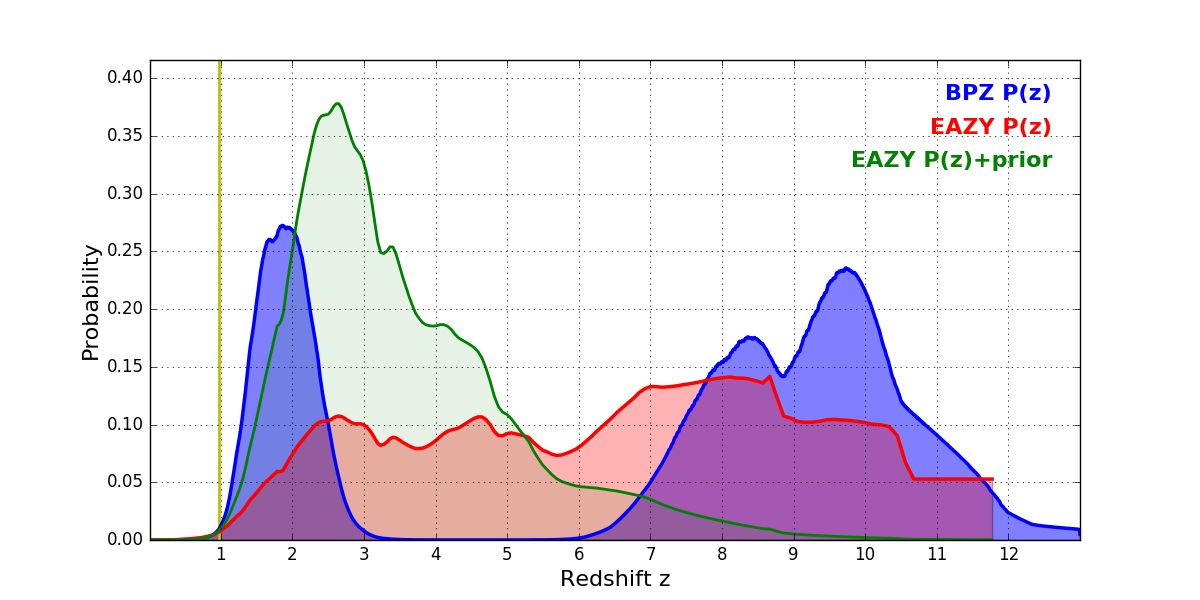 In P(z) plots: Yellow lines mark the cluster redshift z = 0.972,