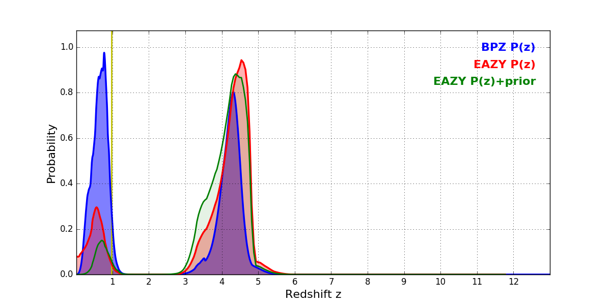 In P(z) plots: Yellow lines mark the cluster redshift z = 0.972,
