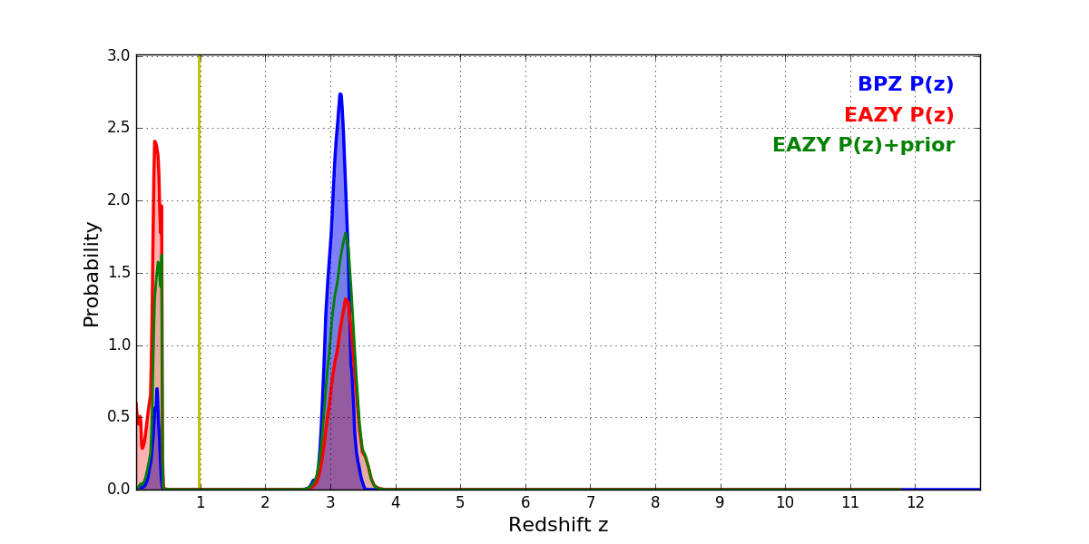 In P(z) plots: Yellow lines mark the cluster redshift z = 0.972,