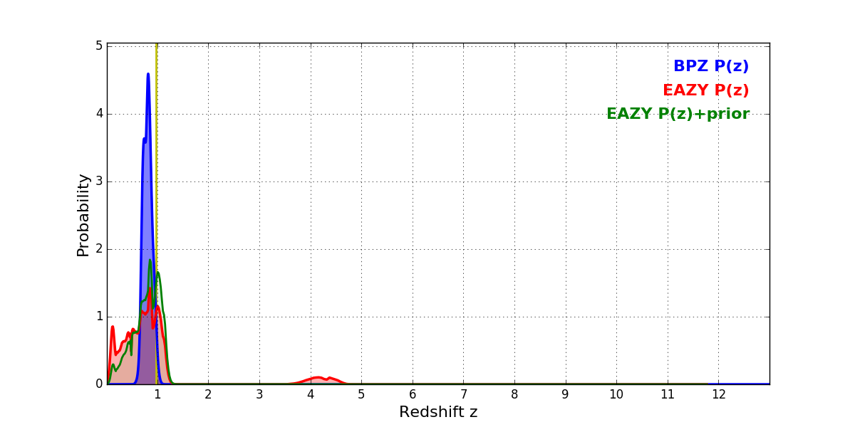 In P(z) plots: Yellow lines mark the cluster redshift z = 0.972,