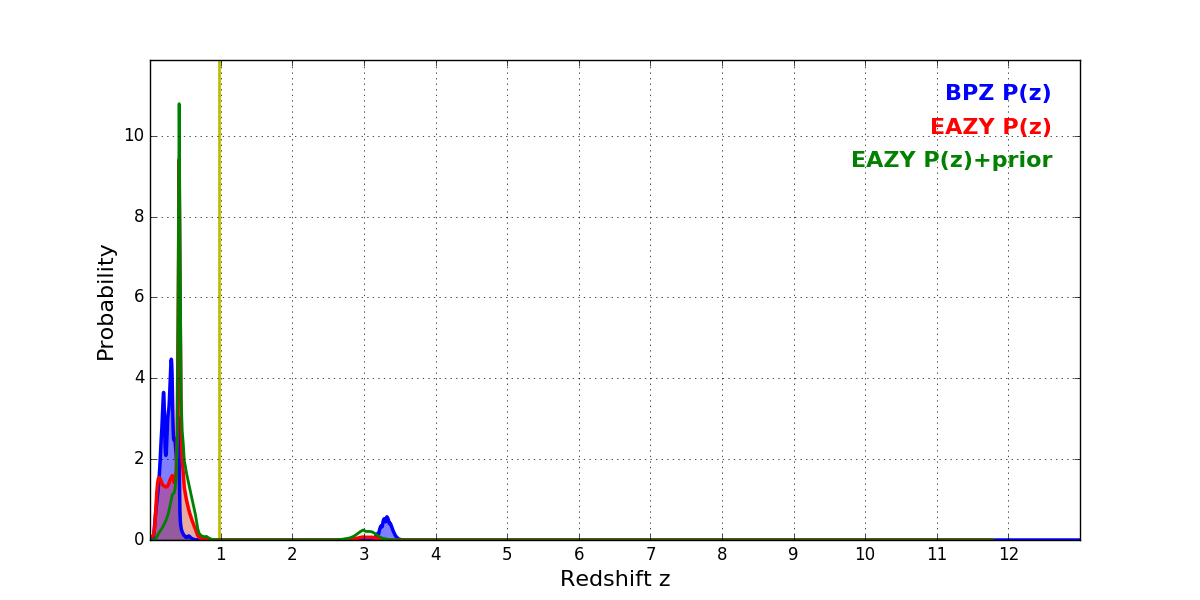 In P(z) plots: Yellow lines mark the cluster redshift z = 0.972,