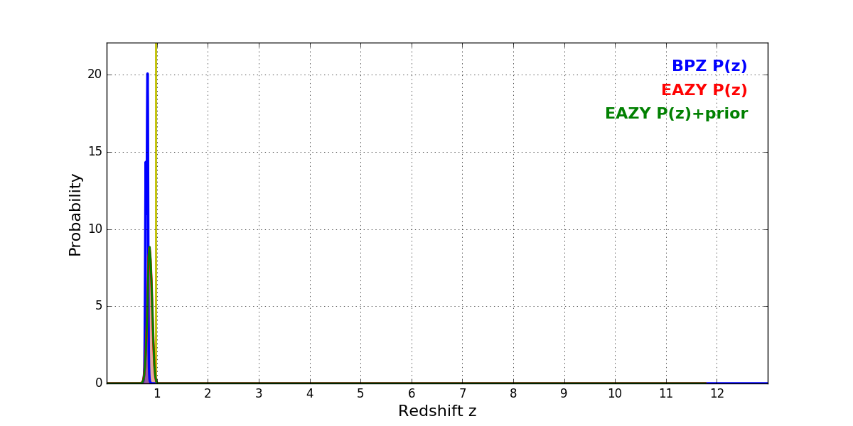 In P(z) plots: Yellow lines mark the cluster redshift z = 0.972,