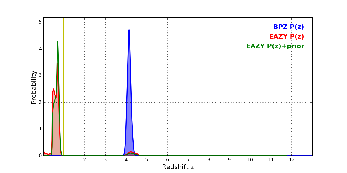 In P(z) plots: Yellow lines mark the cluster redshift z = 0.972,