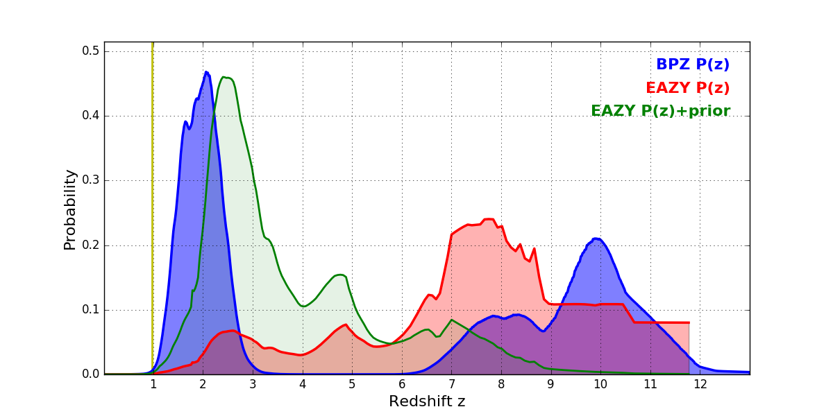 In P(z) plots: Yellow lines mark the cluster redshift z = 0.972,