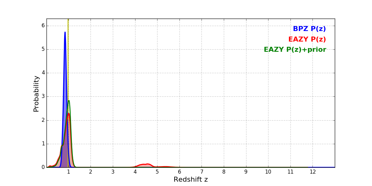 In P(z) plots: Yellow lines mark the cluster redshift z = 0.972,