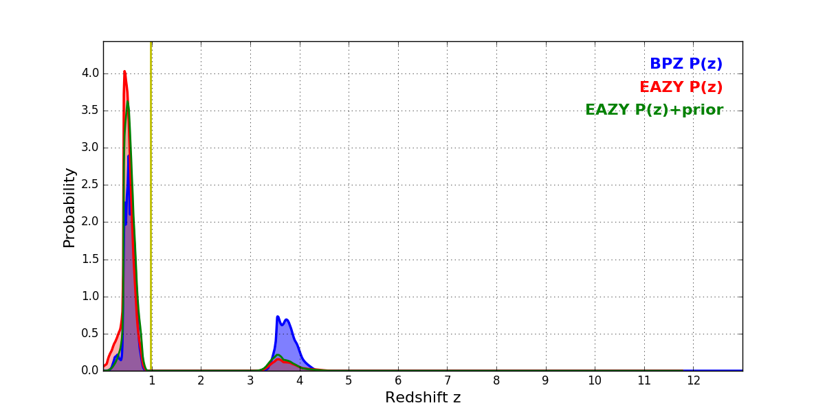 In P(z) plots: Yellow lines mark the cluster redshift z = 0.972,