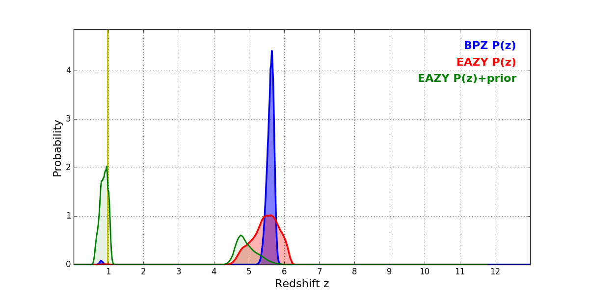 In P(z) plots: Yellow lines mark the cluster redshift z = 0.972,