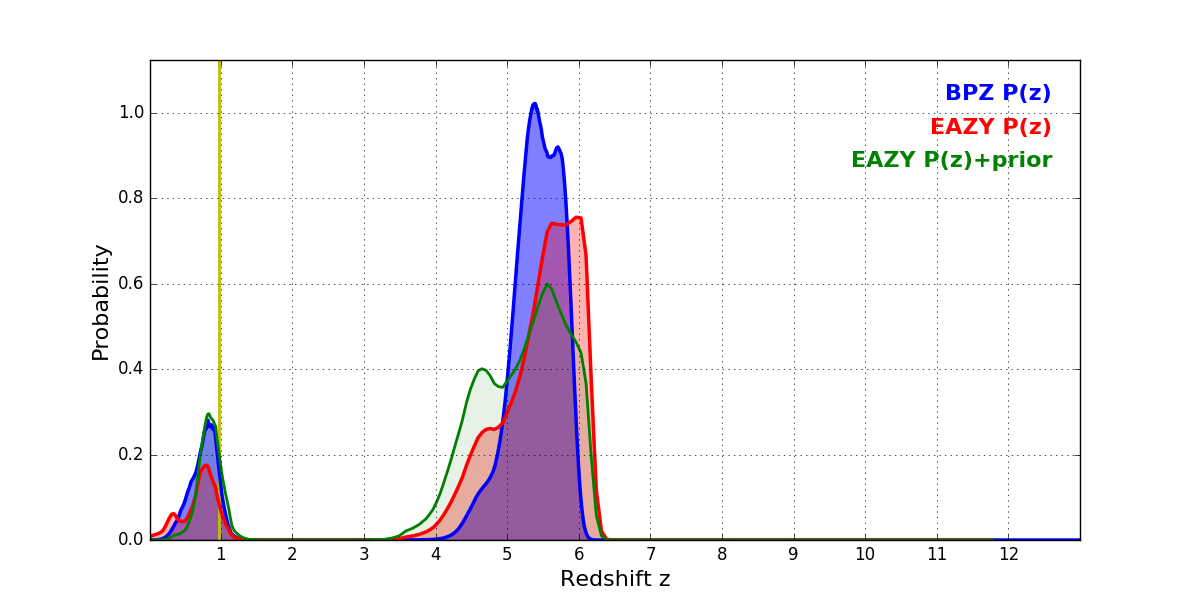 In P(z) plots: Yellow lines mark the cluster redshift z = 0.972,