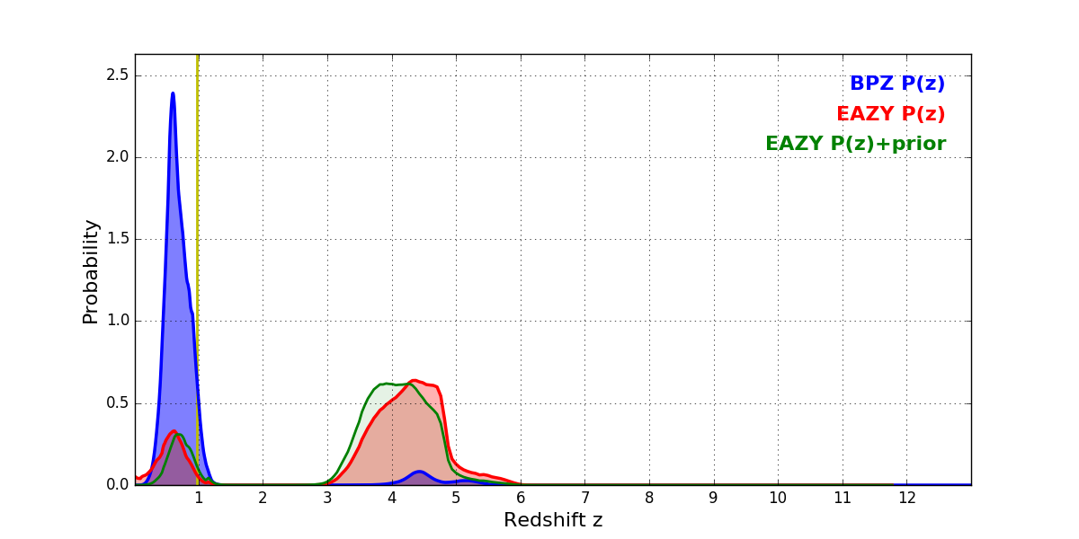In P(z) plots: Yellow lines mark the cluster redshift z = 0.972,