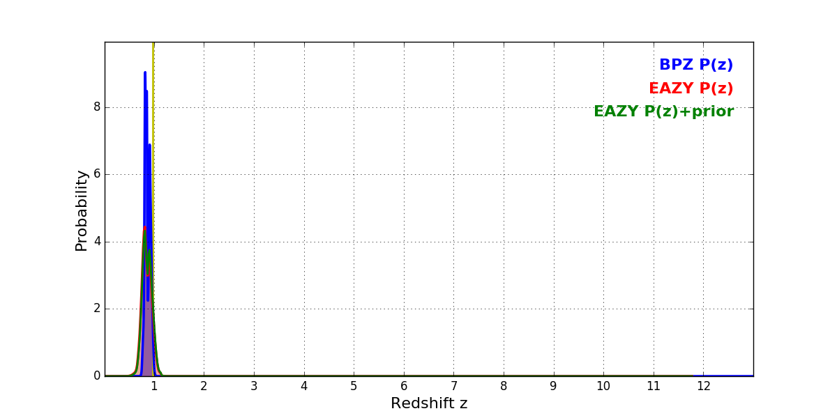 In P(z) plots: Yellow lines mark the cluster redshift z = 0.972,