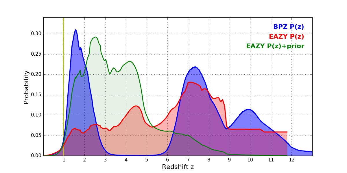 In P(z) plots: Yellow lines mark the cluster redshift z = 0.972,