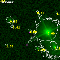 Object #1241 x,y = (4539, 1810) RA, Dec = (06:15:47.904, -57:49:36.48) = (93.94960, -57.82680) BPZ = 1.594 [0.476--3.298] type = 11.00 (SB11_A_0_l) chisq2 = 0.01 ODDS = 0.14 z_cluster = 0.972